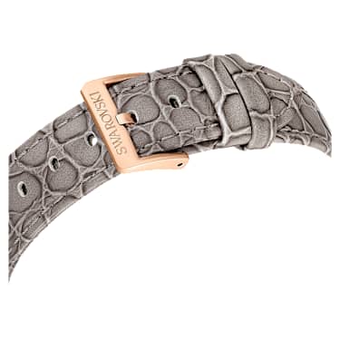This brown chronograph watch delivers a perfect fusion of watchmaking expertise and savoir-faire. The round 37mm case is made with a rose gold-tone finish and features a crystallized bezel, which is neatly faceted and accompanied by a circle of clear pavé. Beneath the mineral glass, the guilloché dial features a swan logo at 12 o’clock, LumiNova coated hands, and three chronograph counters for separate measurements of hours, minutes, and seconds. There are also six clear crystals used for the indexes and a single crystal placed in the watch’s crown. This Swiss made watch is water resistant to 50m and is worn on a quick-release Italian calfskin leather strap in brown with an embossed crocodile pattern.