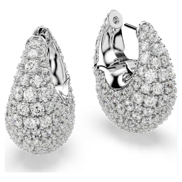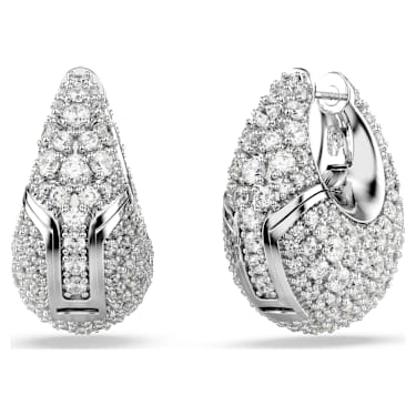 Crafted in the shape of two shimmering droplets, these large earrings are a glamorous choice for personal styling. Each rhodium plated silhouette features a stunning decoration of clear Zirconia, set in place using the chatonnage technique. An additional spring plate mechanism makes these earrings particularly easy to wear. Combine them with a wondrous Sublima pendant or a ring to infuse your entire look with light.