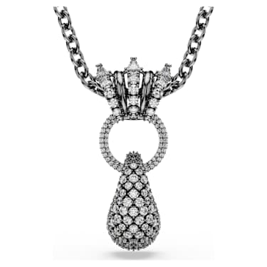 This scintillating pendant is designed with three unique elements, revealing expressivity in every detail. Worn on a long chain, the ruthenium plated design includes metallic spirals with round and spiky Zirconia, a central hoop, and a large droplet at the center that showcases the chatonnage technique. It’s a bold way to style yourself for everyday occasions.