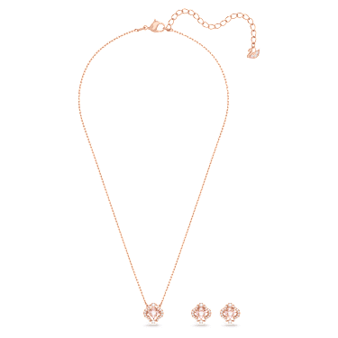 This beautiful Una set from our Sparkling Dance collection impresses with its unique charm and will be a great addition to a jewelry collection. Both the pair of pierced earrings and the necklace feature a pink ‘dancing’ stone in the shape of a clover, which appears to float inside its rose-gold tone plated setting. A touch of clear crystal pavé adds an extra dose of that unique Una sparkle. A lovely gift for yourself or a special someone.